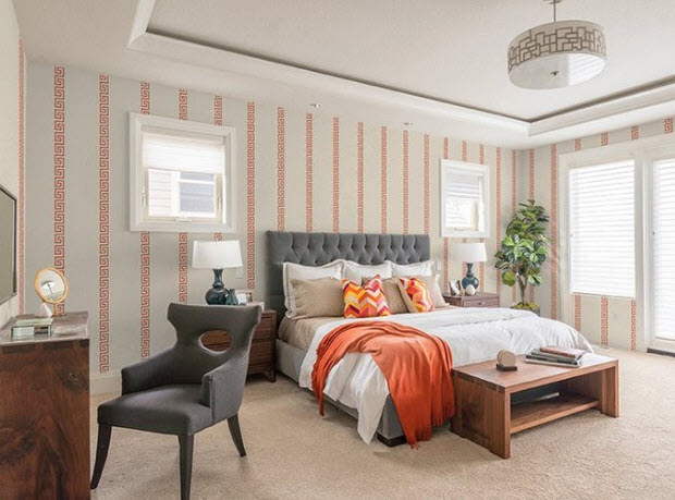 Opt for a more neutral pattern in the guest room and jazz it up with a few pops of color. The spacious bedroom below plays up neutral beige and gray with enthusiastic orange motifs on the wallpaper and coordinating bed coverings.