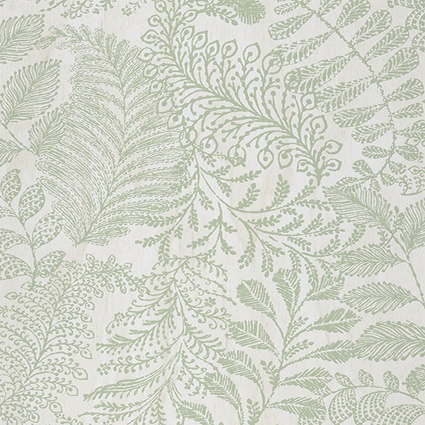 Green botanical wallpaper on a beige background. Fresh and exotic walls.