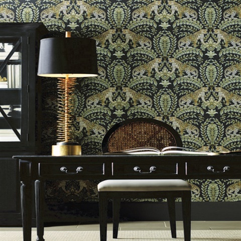 Pattern Name:Black & Green Jungle Leopard & Leaf Wallpaper