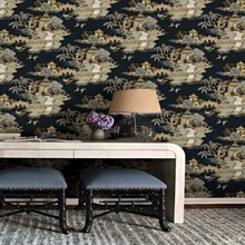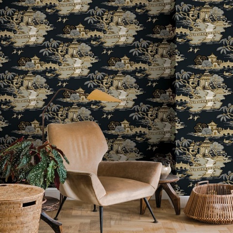 Pattern Name:Black Pagoda Scenic Asian Toile Wallpaper