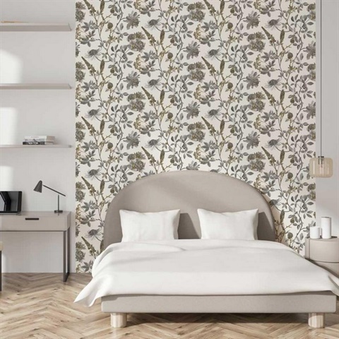 Botanical Blueprint Painterly Branches Grey with Ecru Cream Ground Wallpaper