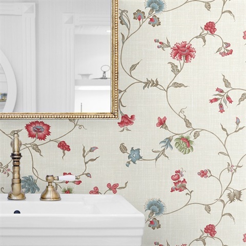 Cranberry & Blue Bell Floral & Leaf Vine Toile Florale Trail Wallpaper