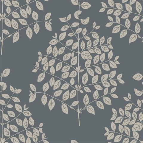 Dark Grey Tender Block Print Textured Leaf Branch Wallpaper