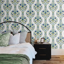 Pattern Name:Floral Ogee Floral Cobalt & Spring Green Peel and Stick Wallpaper