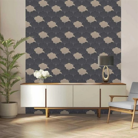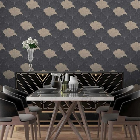 Pattern Name:Giant Art Deco Gingko Leaf Black Wallpaper