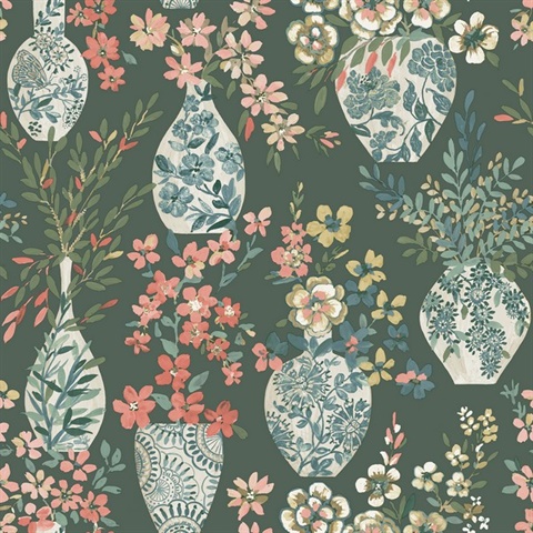 Pattern Name:Harper Green Painterly Floral Vase Wallpaper