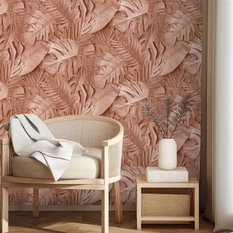 Large Photoreal Tropical Leaves Terracotta Wallpaper