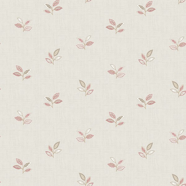 Pink and taupe with a light beige background on a light textured print with tiny leave scattered in little bunches throughout the design.