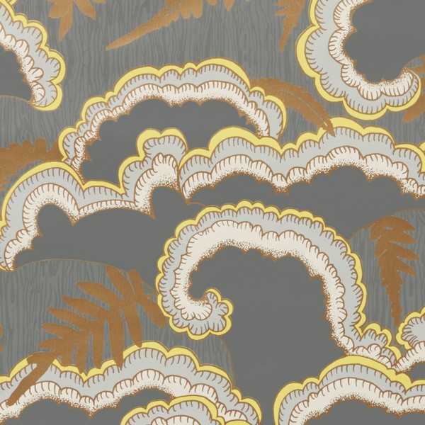 This five-color (including metallic gold) wallpaper is hand-screenprinted using water-based inks on recyclable paper. This paper is also available in two additional colorways.