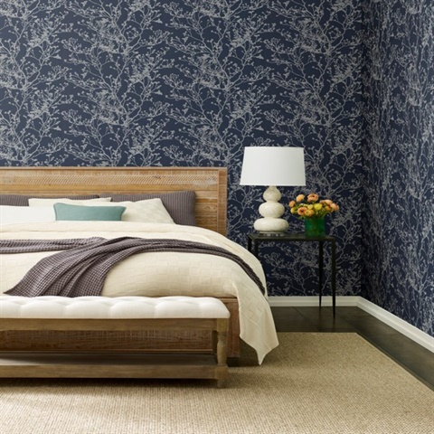 Pattern Name:Navy Blue & Silver Budding Tree Branch Silhouette Wallpaper