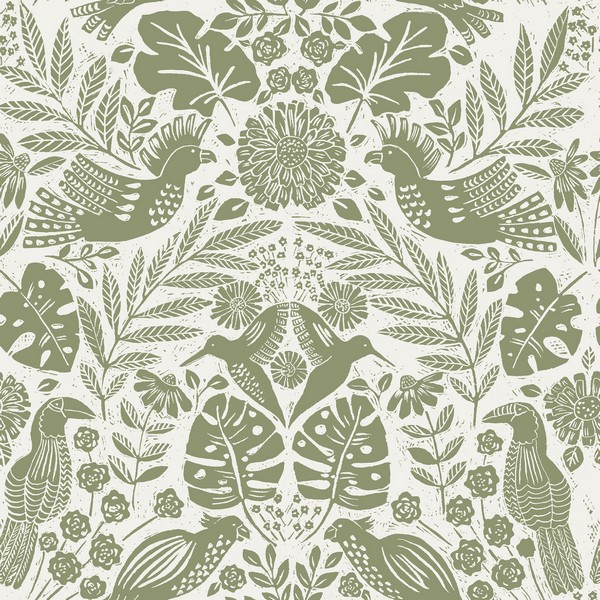 Pattern Name:Nestle Green Bird Block Print Wallpaper