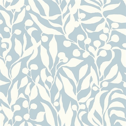 Pattern Name:Olive Mill Sky Blue Mediterranean Silhouette Fruit Branch Wallpaper