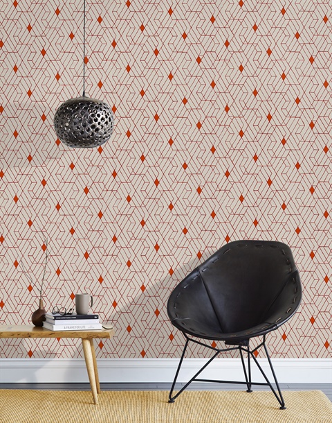Red lines and orange diamonds on a light, warm gray background. Hard meets soft. Inspired originally by layering the geometries of some of Heath's favorite tile shapes (hexagons and diamonds), they stepped back and saw the lines that recall the stitching seen in some of their favorite quilts.