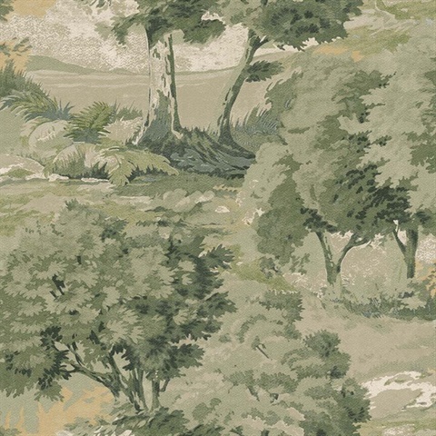 Pattern Name:Scenic Trees Courtyard Green Wallpaper