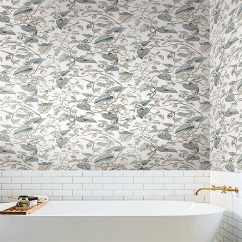 Pattern Name:White & Blue Drawn Moon Flower & Leaf Wallpaper