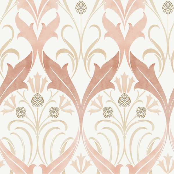 White & Pink Pine Cone Ribbon Damask Wallpaper