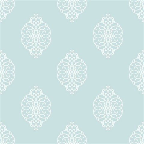 White & Sky Blue Commercial Ironwork Medallion Wallpaper. This is a white & sky blue colored commercial wallcovering. Packaged and sold in 30-yard bolts only. (Please note that is wallpaper is made to order. Samples take one week to be made and cut. Production time for actual orders: 2-3 weeks)